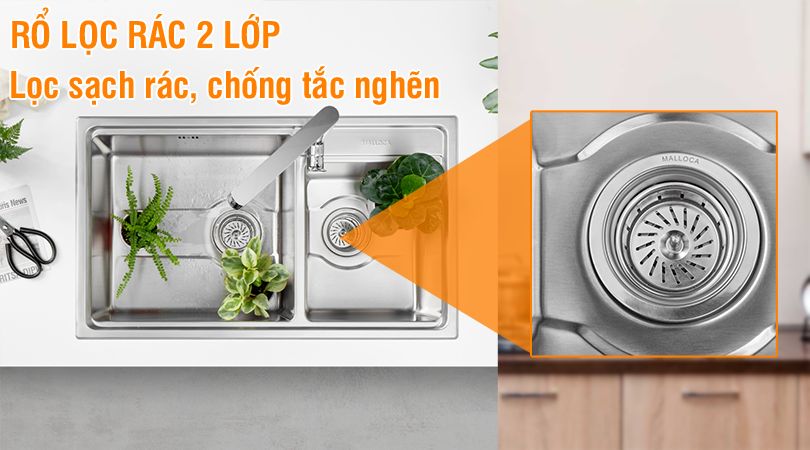 Chậu rửa chén Malloca MS 5082W có rổ lọc rác bằng inox tiện lợi mang lại trải nghiệm tốt cho người sử dụng. Với thiết kế đơn giản, tiện lợi và thông minh đã tạo nên điểm độc đáo cho chậu rửa chén Malloca MS 5082W.