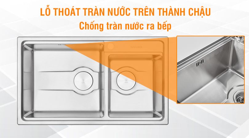 Với tiện ích thông minh này, nước trong chậu sẽ được thoát ra một cách nhanh chóng và hiệu quả. Thiết kế này giúp ngăn ngừa tình trạng nước đọng lại trong chậu và đảm bảo không gian rửa chén luôn sạch sẽ.
