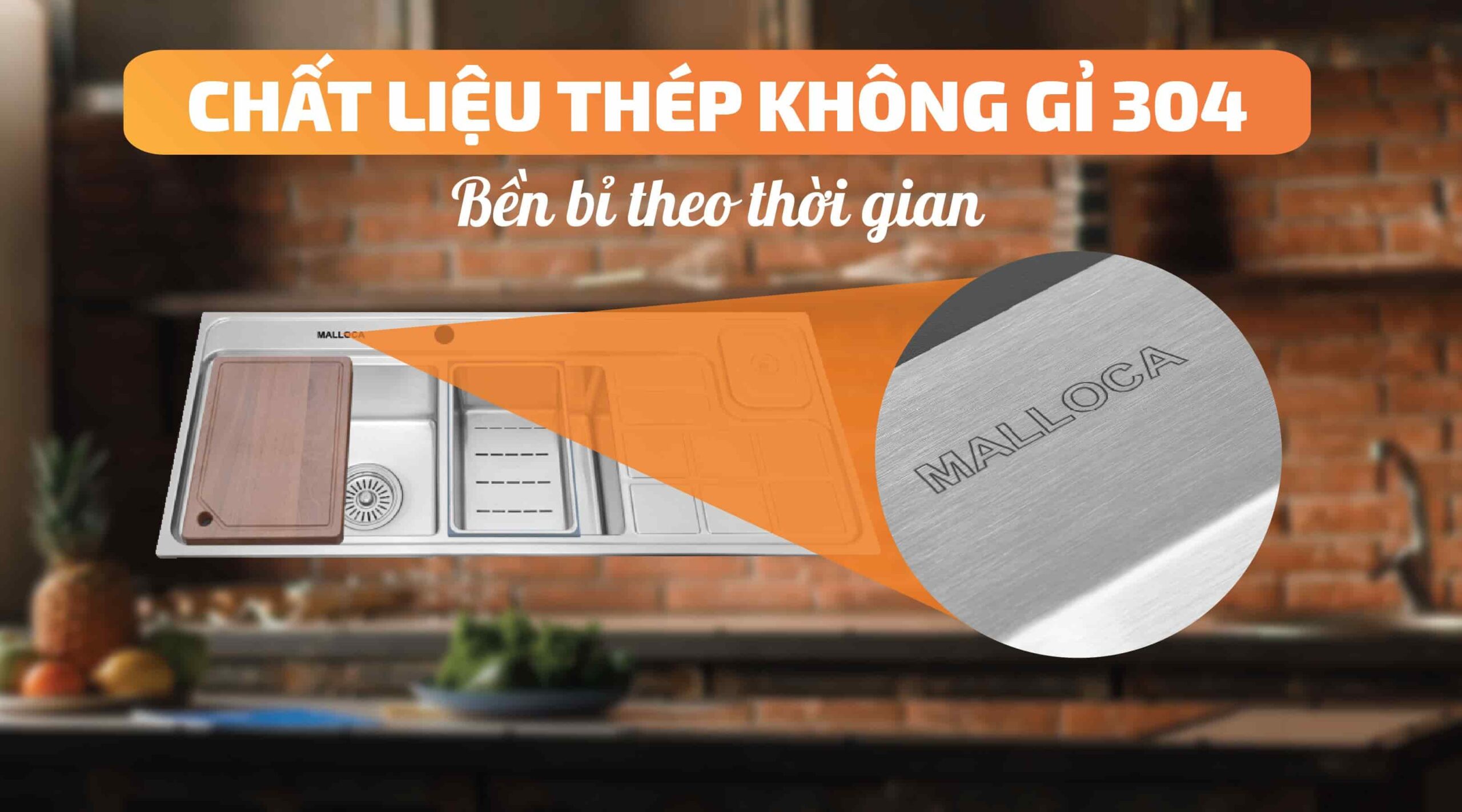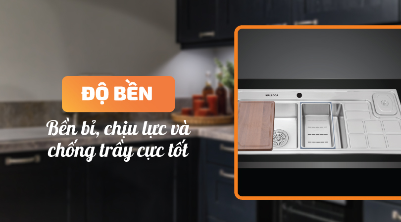 Chậu rửa chén 2 hộc rửa Malloca MS 8817 được làm từ Inox 304, một loại chất liệu bền bỉ và chống trầy xước. Điều này giúp chậu Malloca chịu được va đập và ma sát hàng ngày mà không bị trầy xước hay hỏng hóc.