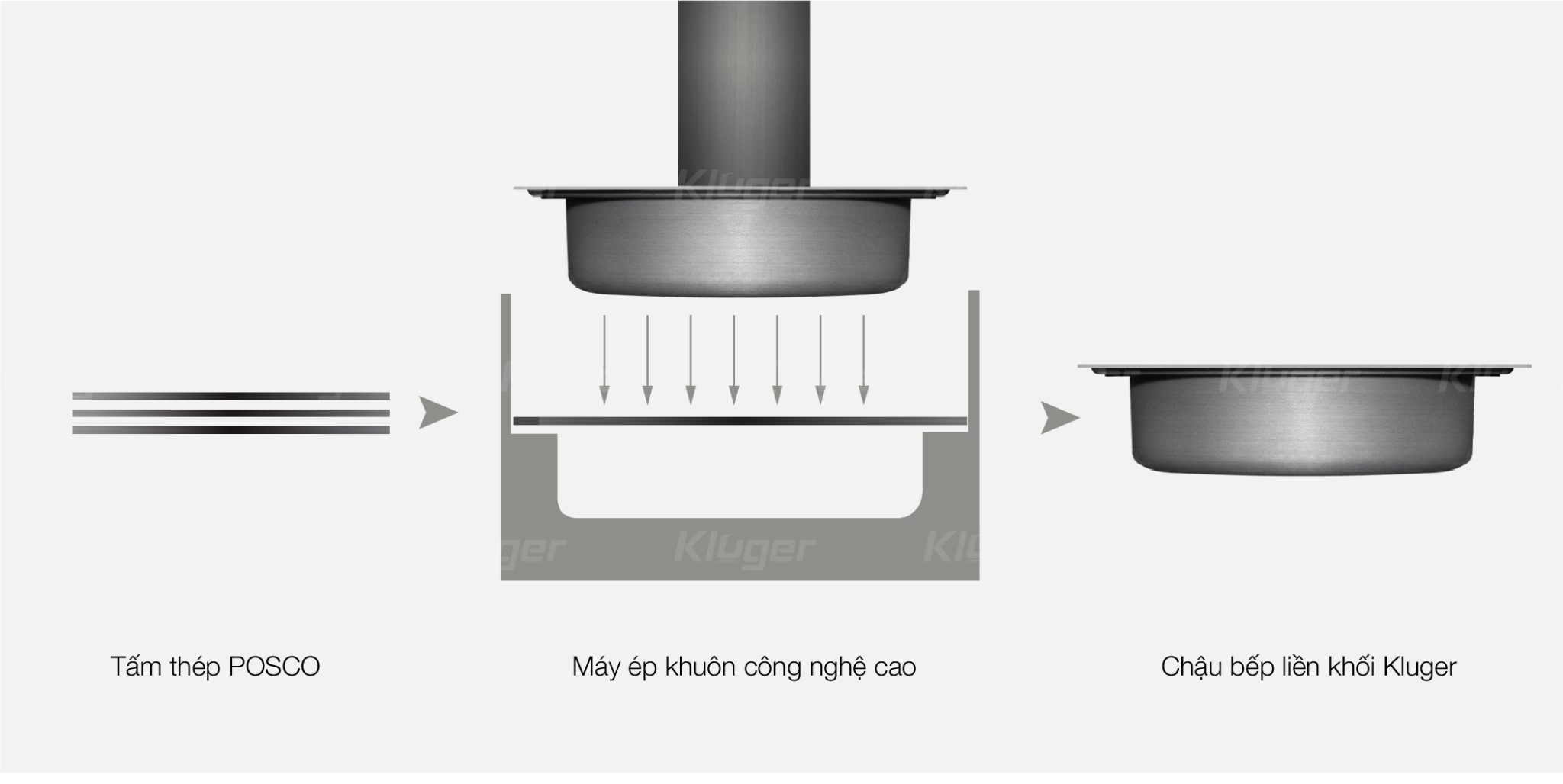 Công nghệ ép khuôn liền khối – Đột phá sáng tạo trong ngành sản xuất, phương pháp này giúp Kluger tạo ra sản phẩm chậu rửa bát / bồn rửa chén có cấu trúc vững chắc từ một mảnh vật liệu POSCO 304 duy nhất không có mối hàn hay vết nối, đảm bảo sự an toàn và tin cậy trong suốt quá trình sử dụng.