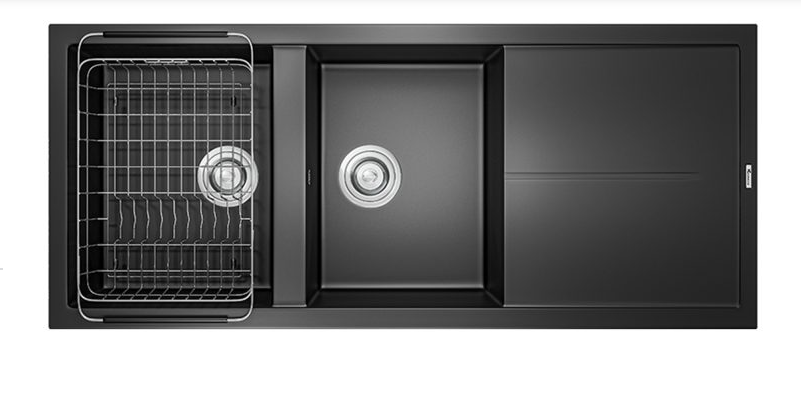 Sản phẩm Chậu rửa bát Granite Sink Livello Smart 1160 – Black có một bàn chờ gắn liền giúp bạn có thêm không gian sắp xếp đồ bếp và rãnh thoát nước thông minh trên bàn chờ giữ cho căn bếp luôn khô thoáng tiện lợi.
