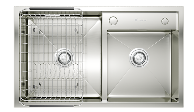 Sản phẩm thiết kế sâu lòng, người dùng linh hoạt trong việc lựa chọn hố chậu theo nhu cầu sử dụng, giúp tiết kiệm nước với thiết kế 2 hố chậu lệch.