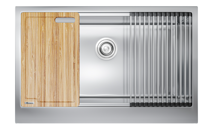 Workstation – Apron Sinks (hay còn gọi Farmhouse sinks) – dòng sản phẩm được Konox lấy cảm hứng, phát triển từ căn bếp nông trại nơi miền quê yên bình của Châu Âu – gian bếp là trái tim của ngôi nhà phong cách đồng quê.