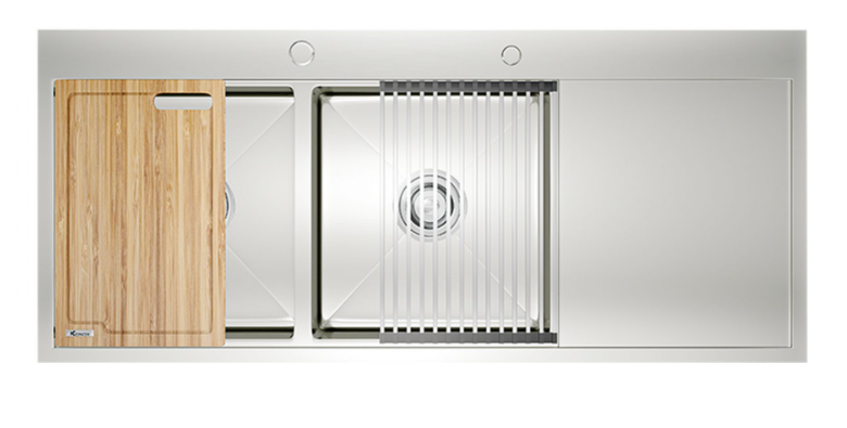 Chậu rửa bát Workstation Sink – Topmount Sink KN11650TD là sản phẩm duy nhất trong bộ sưu tập chậu handmade có tích hợp bàn chờ – một cải tiến mới về cả thẩm mỹ và công năng từ Konox.