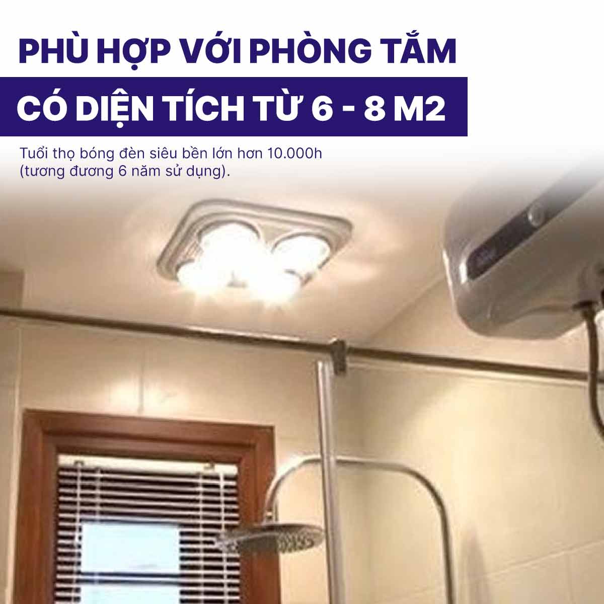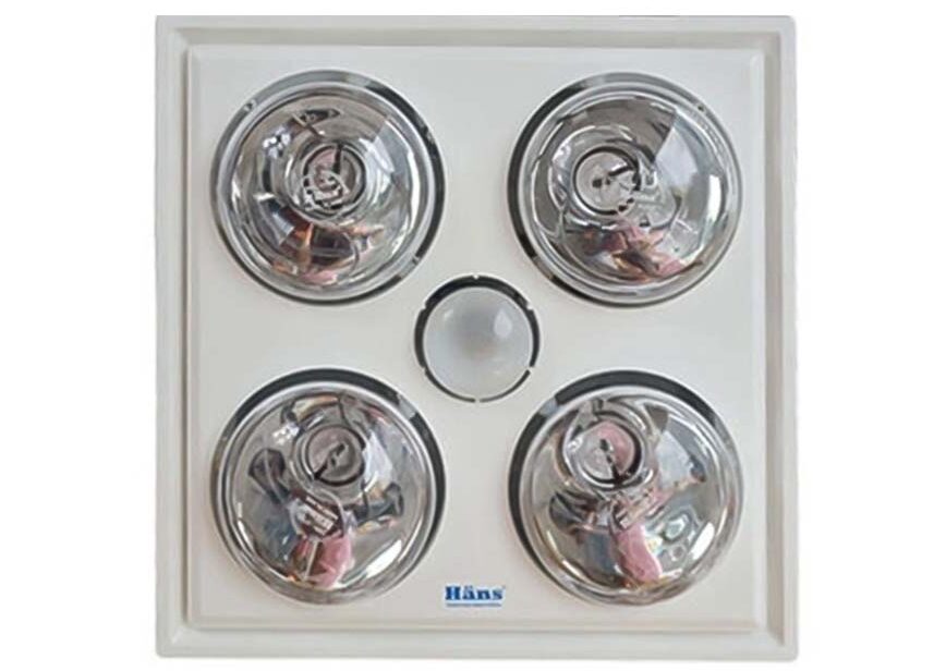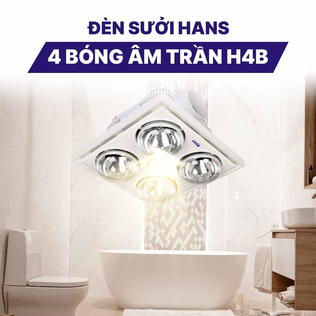 - Đèn sưởi nhà tắm Hans Âm Trần 4 bóng H4B phù hợp với phòng tắm có diện tích từ 6 – 8 m2. Bóng đèn Hans được sản xuất trên dây chuyền hiện đại chống cháy nổ khi gặp nước, làm ấm cực nhanh chỉ sau vài giây giúp tiết kiệm điện. Tuổi thọ bóng đèn siêu bền lớn hơn 10.000h (tương đương 6 năm sử dụng).