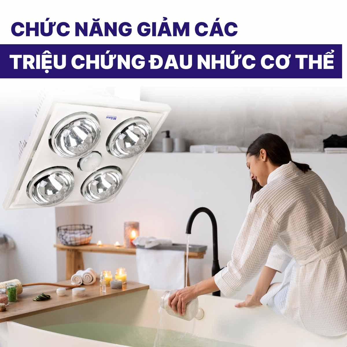 - Đèn Sưởi Âm Trần H4B sử dụng bóng hồng ngoại không chỉ sưởi ấm mà còn giúp làm giảm các triệu chứng đau nhức cơ thể, tốt cho những người bị đau nhức xương khớp. Đồng thời còn tăng cường trao đổi chất, kích thích tuần hoàn máu, cho bạn cảm giác thật sảng khoái.
