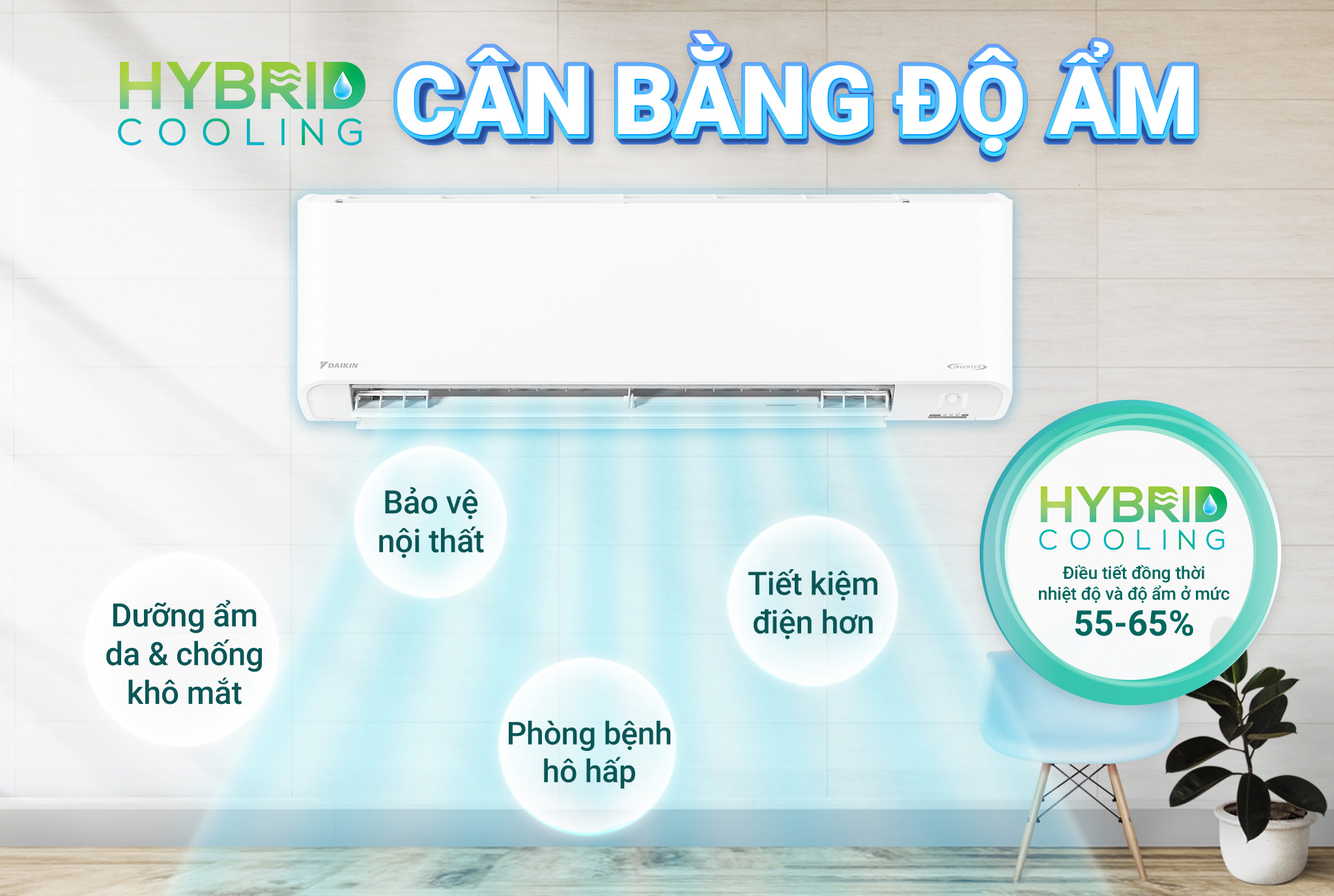 Trong điều kiện khí hậu nóng ẩm như Việt Nam, tính năng Hybrid Cooling kiểm soát đồng thời nhiệt độ và độ ẩm, giữ độ ẩm phòng luôn ở mức lý tưởng 55–65%. Nhờ đó, không chỉ giúp không gian mát mẻ dễ chịu mà còn hạn chế nấm mốc, vi khuẩn phát triển, bảo vệ sức khỏe và nội thất ngôi nhà.