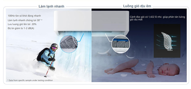 Điều hòa Carrier 2 chiều Inverter 24.000 BTU 42HIT024/38HIT024 sẽ khởi động ở tần số 100Hz giúp nhanh chóng làm lạnh căn phòng của bạn chỉ trong 30 giây. Bên cạnh đó, cánh đảo gió của chiếc điều hòa này có 1.422 lỗ nhỏ giúp phân tán luồng gió dịu mát.