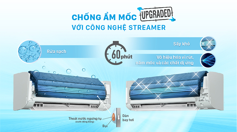 Hơn nữa, công nghệ Streamer còn giúp loại bỏ nấm mốc, vi rút, vi khuẩn và các chất gây hại hiệu quả đến 99,9% giúp giữ dàn tản nhiệt sạch sẽ khi kết hợp với chức năng chống ẩm mốc. Chức năng chạy quạt sẽ hoạt động song song với công nghệ Streamer và kéo dài tối đa trong 60 phút. Nhờ sự kết hợp này, bên trong dàn lạnh, dàn tản nhiệt và đường thổi gió sẽ được làm khô, đồng thời vô hiệu hóa các chất độc hại như vi rút, nấm mốc và các chất gây dị ứng.