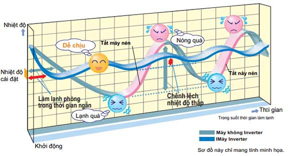 Máy điều hòa không khí inverter vận hành ở công suất tối đa ngay khi khởi động để nhanh chóng đạt được nhiệt độ cài đặt.