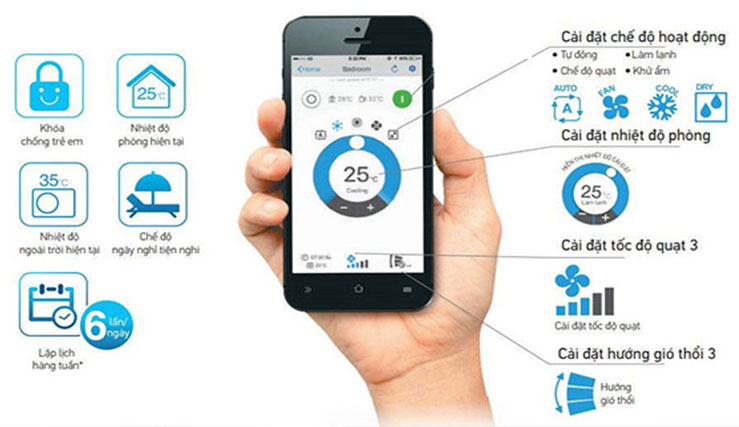 Máy lạnh Daikin FTKZ71VVMV/RKZ71VVMV hỗ trợ điều khiển từ xa thông qua ứng dụng trên điện thoại thông minh. Người dùng có thể dễ dàng điều chỉnh nhiệt độ, chế độ làm lạnh và thiết lập lịch trình hoạt động mọi lúc, mọi nơi.