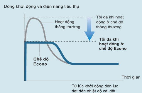 Chức năng Eco tích hợp trên điều khiển từ xa sẽ hạn chế dòng khởi động và điện năng tiêu thụ hoạt động ở mức tối đa. Ngoài ra chức năng Econo còn có tác dụng ngăn ngừa cầu dao quá tải tại những thời điểm tải làm lạnh hoặc sưởi lớn tạm thời.