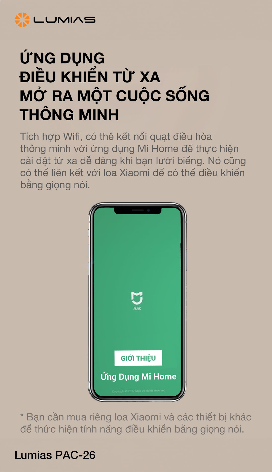 Máy điều hòa di động Lumias PAC-26 tích hợp Wifi cho phép bạn kết nối máy với ứng dụng Mi Home, mang đến khả năng tùy chỉnh cài đặt một cách thuận tiện ngay cả khi bạn đang không ở nhà. Hơn thế nữa, máy có thể liên kết với loa Xiaomi, mở ra khả năng điều khiển bằng giọng nói, giúp cuộc sống của bạn trở nên tiện nghi hơn bao giờ hết.