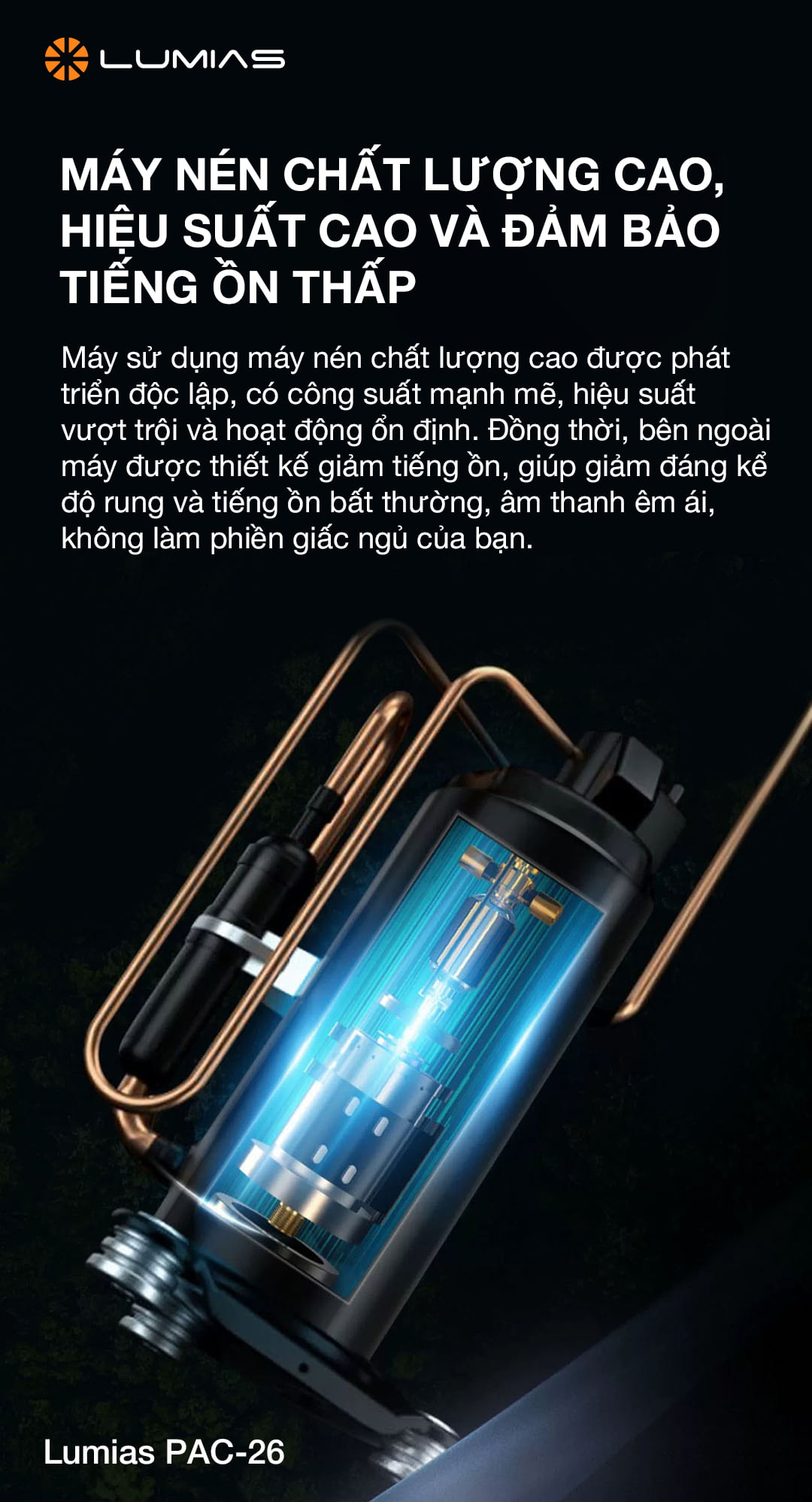 Điều hòa Lumias PAC-26 được trang bị máy nén chất lượng cao, do chính nhà sản xuất Lumias phát triển, giúp máy hoạt động với công suất mạnh mẽ và làm mát hiệu quả mà vẫn bền bỉ. Thêm vào đó, vỏ ngoài của máy được thiết kế giảm thiểu tiếng ồn tối đa. Nhờ vậy, máy vận hành êm ái, không gây rung lắc hay âm thanh khó chịu, đảm bảo bạn có một giấc ngủ ngon và không bị làm phiền.