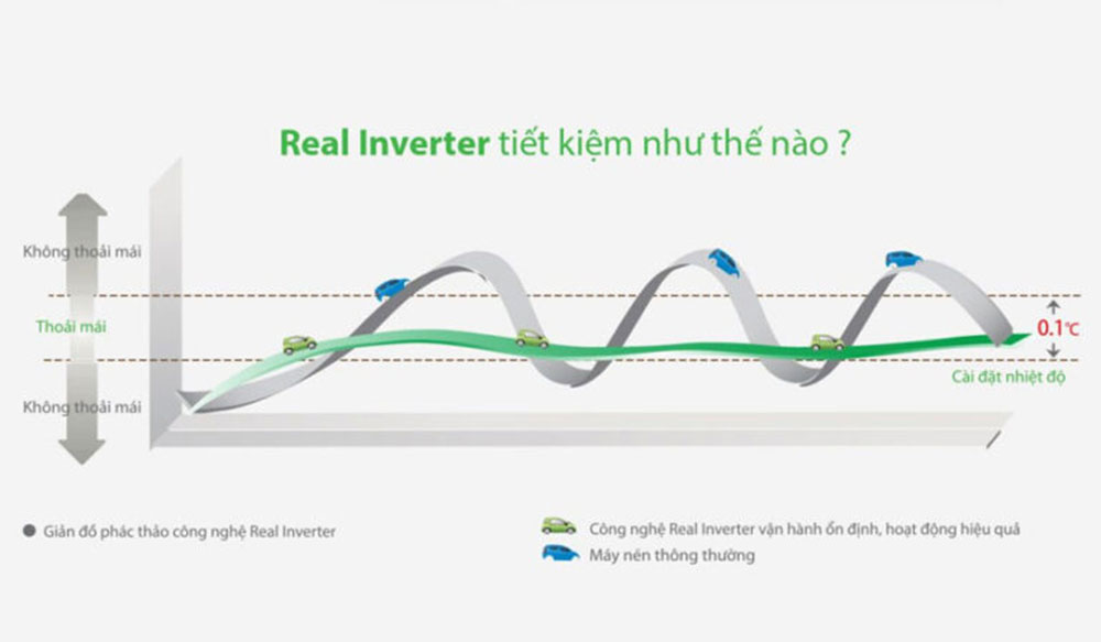Công nghệ Real Inverter giúp COSMO9CI duy trì nhiệt độ phòng ổn định và x2 khả năng tiết kiệm điện so với các loại máy làm lạnh thông thường. Nhờ vào cấu tạo chỉnh xác của máy nén Gree, các thành phần hoạt động đồng bộ, tránh biến đột nhiệt độ đốt ngột.