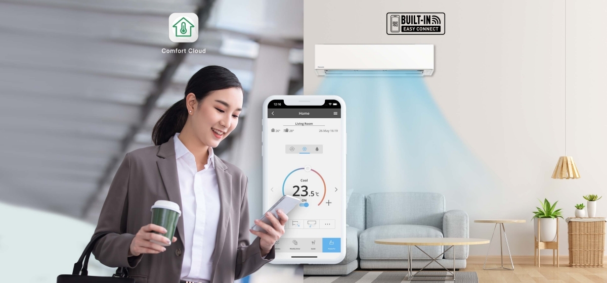 Chức năng kết nối Wi-Fi được tích hợp sẵn và Ứng dụng Panasonic Comfort Cloud cho phép kết nối và điều khiển nhiều máy điều hòa không khí từ bất cứ nơi đâu, ngay tại nhà hay từ xa.