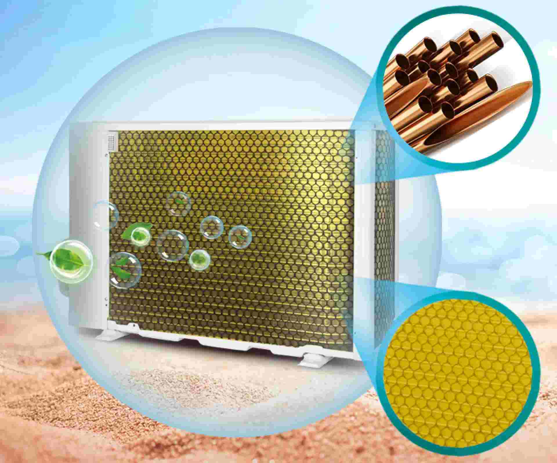 Dàn tản nhiệt của Hisense AS-12CR4RVEDJ01 sử dụng chất liệu bằng đồng, cánh tản nhiệt mạ vàng phủ lớp chống ăn mòn hiệu quả gấp 3 – 4 lần so với dàn tản nhiệt thông thường khác, nhờ đó góp phần nâng cao tuổi thọ máy, giúp tiết kiệm điện năng hiệu quả cũng như nâng cao hiệu suất trao đổi nhiệt.