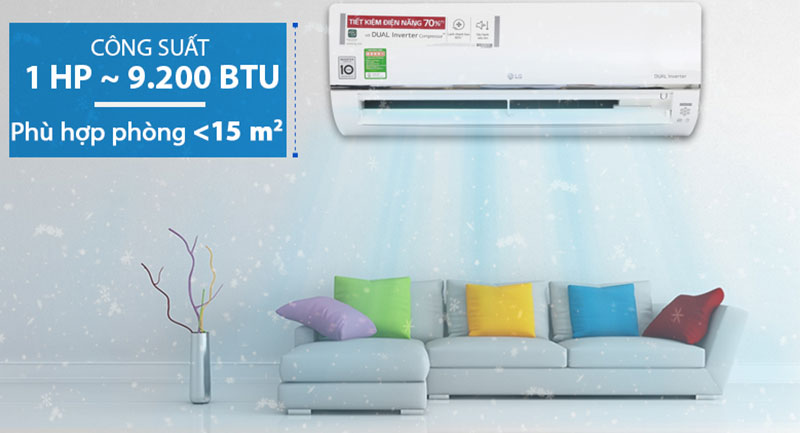 Máy lạnh LG Inverter 1 HP V10API có thiết kế màu trắng trung tính, đi cùng kích thước nhỏ gọn, công suất 1 HP, máy lạnh sẽ là sự lựa chọn lý tưởng cho những căn phòng dưới 15 m2 như phòng ngủ nhỏ, phòng làm việc cá nhân.