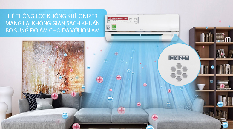 Từ nay bạn không còn phải lo lắng vì bị khô da khi ngồi máy lạnh quá lâu nữa vì hệ thống lọc không khí Ionizer của máy lạnh không những giúp bổ sung các ion cung cấp độ ẩm cho da mà còn đảm bảo không khí luôn trong lành.