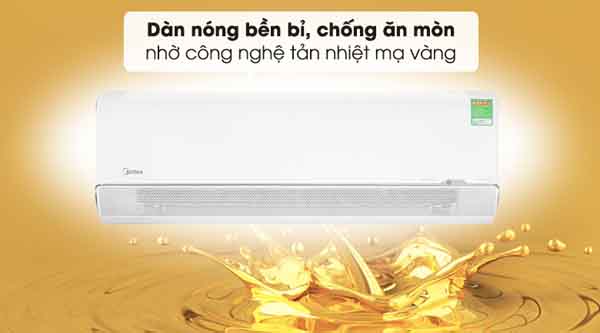 Điều hòa Midea MSAFII-24CRN8 sử dụng dàn tản nhiệt bằng nhôm phủ lớp mạ vàng chống ăn mòn, bảo vệ lá tản nhiệt trước các tác nhân gây hại của môi trường như axít ăn mòn, bám bụi bẩn và nồng độ muối cao trong không khí. Ngoài ra, lá tản nhiệt nhôm mạ vàng còn giúp nâng cao hiệu quả trao đổi nhiệt, giúp việc làm lạnh của máy tốt hơn.