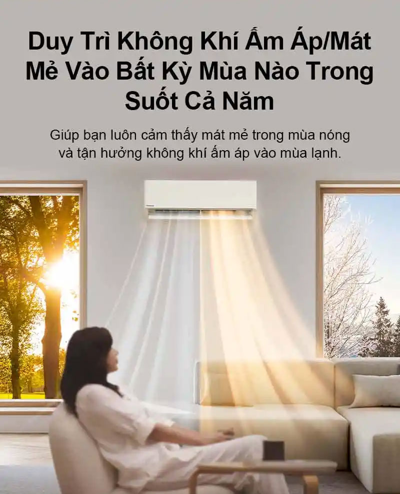 Công nghệ Inverter: Điều chỉnh công suất hoạt động linh hoạt, giúp giảm tiêu thụ điện năng đáng kể mà vẫn đảm bảo hiệu suất làm lạnh/sưởi ấm.