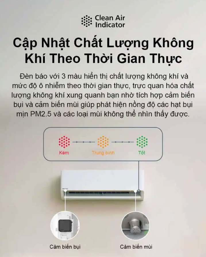 Cảm biến mùi và bụi tích hợp đèn báo: Điều hòa được trang bị cảm biến tiên tiến giúp phát hiện mức độ ô nhiễm trong không khí và cảnh báo bằng đèn báo chất lượng không khí, giúp người dùng dễ dàng theo dõi và điều chỉnh chế độ vận hành phù hợp.