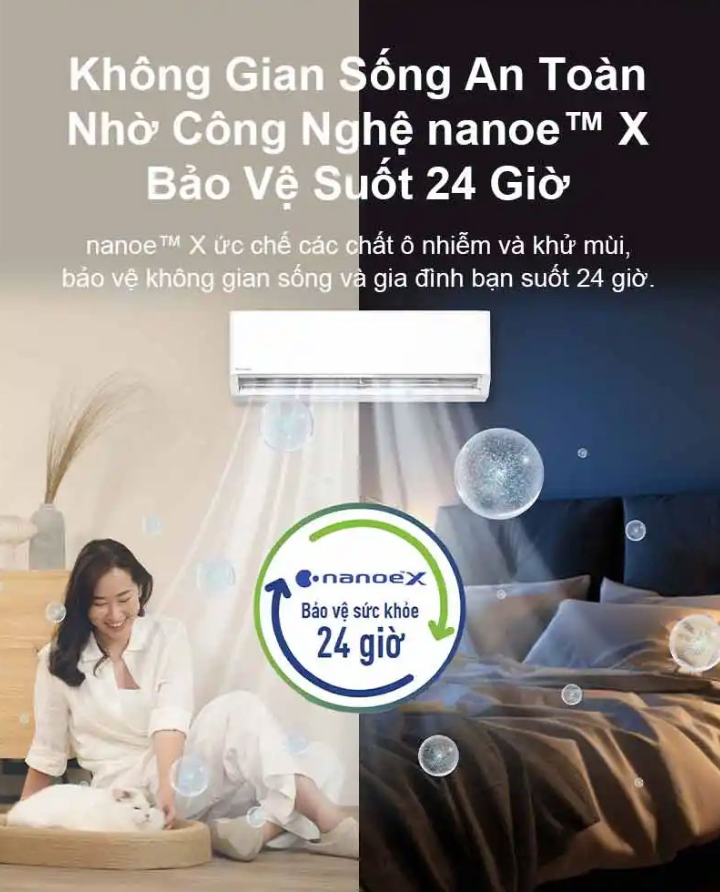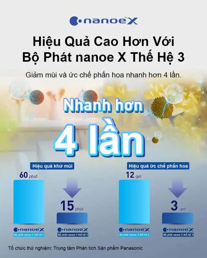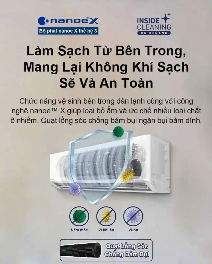 Công nghệ nanoeX thế hệ 3: Giải phóng hàng tỷ gốc OH để ức chế vi khuẩn, vi-rút, nấm mốc và các tác nhân gây dị ứng, đồng thời khử mùi khó chịu hiệu quả.