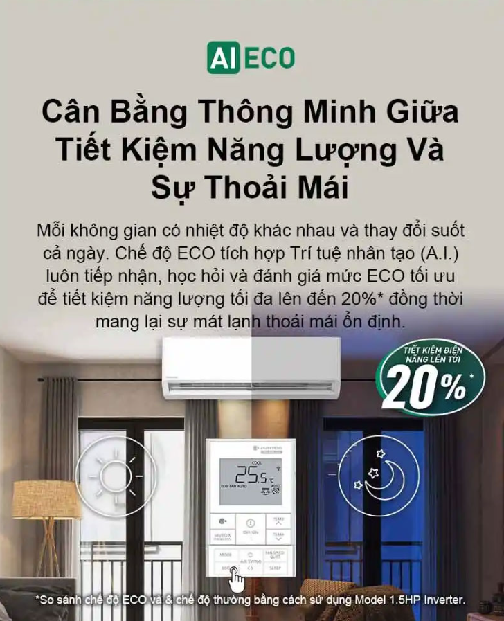 Cảm biến Econavi: Tự động điều chỉnh công suất dựa trên sự hiện diện của con người và mức độ ánh sáng trong phòng, giảm hao phí điện năng không cần thiết.