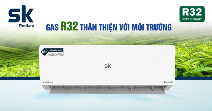 Điều hòa Sumikura giá rẻ APS/APO-H280/MORANDI sử dụng môi chất lạnh R32 thân thiện với môi trường, giảm thiểu lượng khí nhà kính thải ra môi trường, đồng thời giúp người dùng sử dụng năng lượng hiệu quả hơn nhờ đặc tính tạo hơi lạnh sâu hơn.