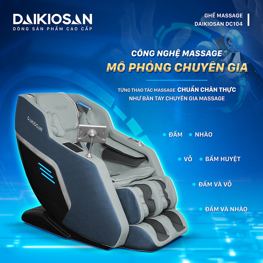 Ghế massage Daikiosan DC104 là một sản phẩm đỉnh cao được ứng dụng công nghệ AI thông minh và công nghệ massage 3D đỉnh cao tạo ra 20 chương trình massage tự động cho phép giả lập các thao tác nhào, đấm, vỗ, bấm huyệt, nhào và vỗ như bàn tay người thật.