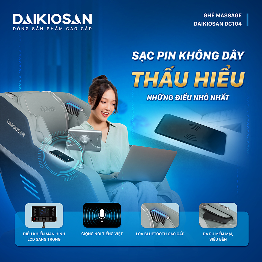 Khi người dùng sử dụng, ghế massage DC104 sẽ tác động sâu đến từng huyệt đạo, cơ bắp giúp bạn giảm đau nhức cơ thể một cách hiệu quả. Ghế massage cao cấp Daikiosan DC104 là một lựa chọn tuyệt vời cho những ai muốn trải nghiệm một liệu pháp massage chuyên nghiệp ngay tại nhà.
