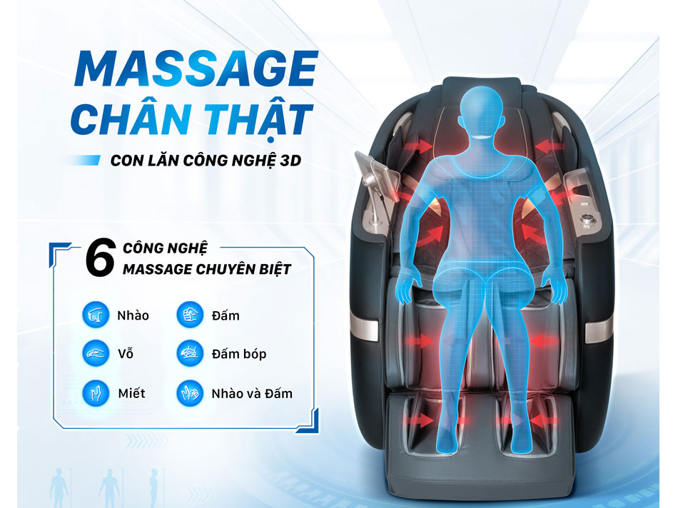 Công nghệ massage 3D là một tính năng đặc biệt của ghế massage Daikiosan DC105. Hệ thống con lăn 3D chuyển động theo không gian 3 chiều: Rộng (trái/phải), dài (lên/xuống), sâu (trong/ngoài) sẽ mang đến cảm giác massage như bàn tay của chuyên gia trị liệu. Các động tác massage này giúp tác động sâu vào các huyệt đạo và cơ bắp giúp giảm đau nhức và thư giãn cơ thể hiệu quả.