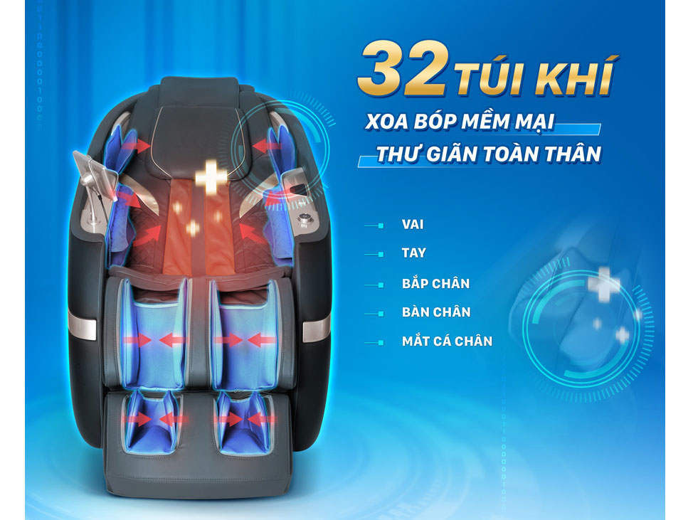 Những túi khí này tạo ra lực ấn nhẹ nhàng giúp xoa bóp các cơ bắp và huyệt đạo, từ đó giảm đau nhức và mang lại cảm giác thư giãn tuyệt vời. Ngoài ra, hệ thống túi khí còn hỗ trợ cải thiện tuần hoàn máu, giảm mỏi cơ và cải thiện sức khỏe tổng thể.
