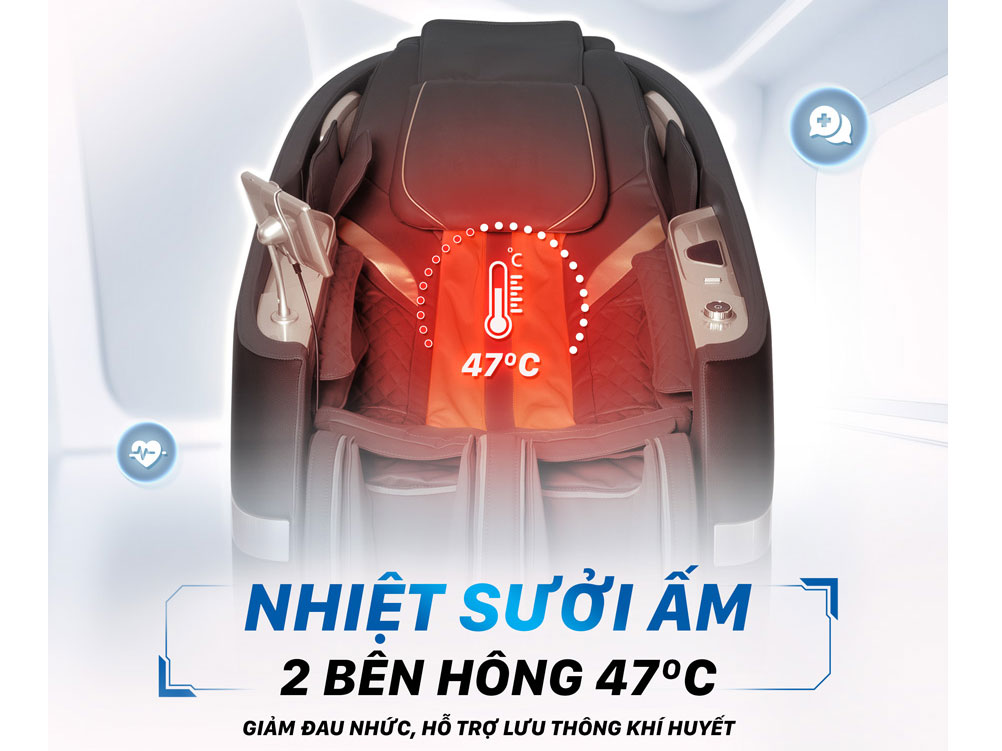Ghế massage Daikiosan DC105 cũng tích hợp tính năng massage nhiệt ở lưng giúp sưởi ấm và giảm đau hiệu quả. Nhiệt độ siêu ấm không chỉ giúp làm dịu các cơ bắp căng thẳng mà còn hỗ trợ cải thiện tuần hoàn máu giúp cơ thể nhanh chóng phục hồi và thư giãn.