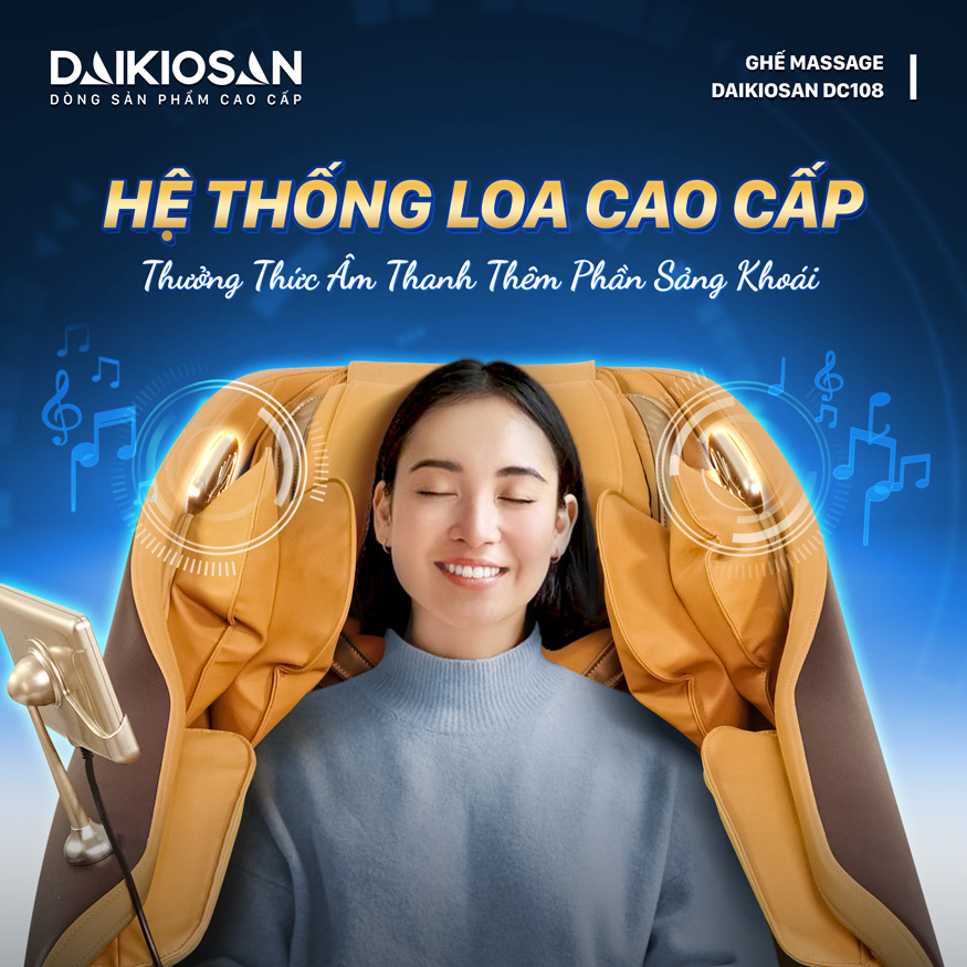 Một tính năng đáng chú ý trên ghế massage Daikiosan DC108 là khả năng kết nối Bluetooth với loa nghe nhạc chất lượng cao. Bạn có thể dễ dàng kết nối ghế massage với điện thoại hoặc các thiết bị khác để phát nhạc yêu thích trong khi thư giãn. Điều này giúp tạo ra không gian thư giãn tuyệt vời, kết hợp với massage để mang lại sự thư thái tối đa cho cả cơ thể và tâm trí. Với hai loa stereo được tích hợp trong ghế, bạn sẽ tận hưởng âm thanh rõ ràng, sống động, góp phần nâng cao trải nghiệm massage của mình.