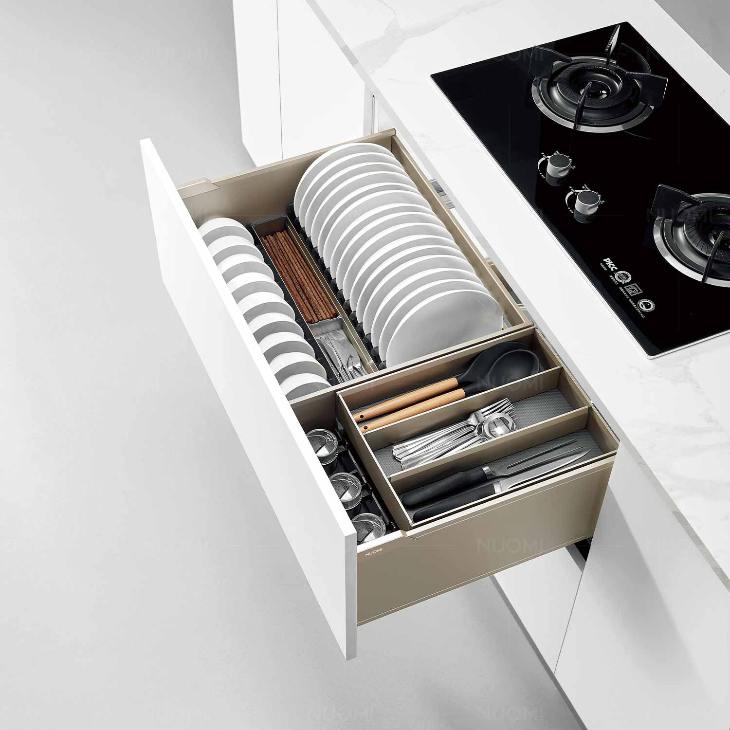 Cấu trúc độc đáo của giỏ kéo ra, có khay đựng dao kéo bên trong dạng trượt, cải thiện tỷ lệ sử dụng không gian. Giá đựng bát đĩa, hộp đựng dao và dĩa có thể di chuyển, tiện lợi và linh hoạt. Cấu trúc lắp đặt nhanh cho cửa tủ, dễ dàng và thuận tiện khi lắp đặt.