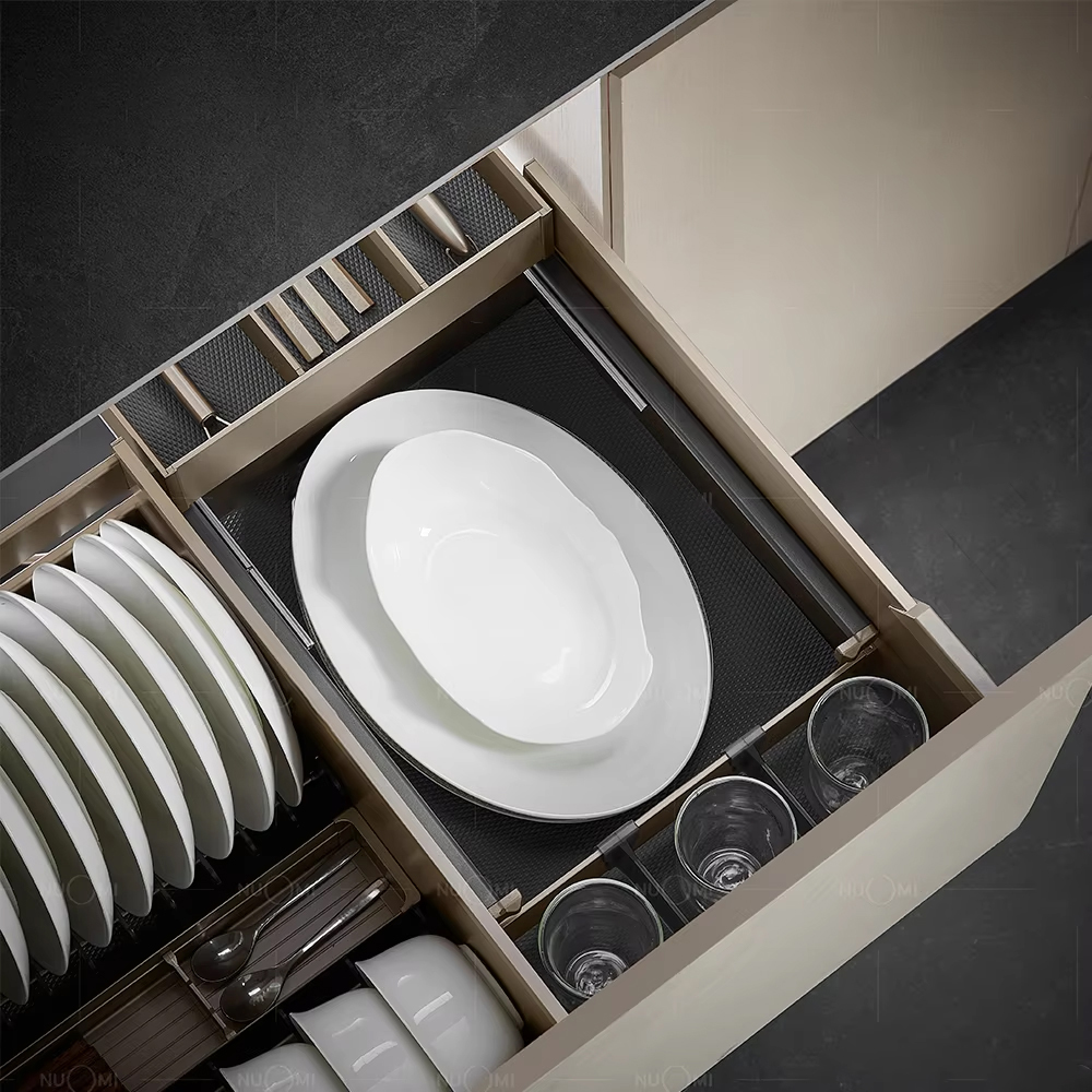 Cấu trúc độc đáo của giỏ kéo ra, có khay đựng dao kéo bên trong dạng trượt, cải thiện tỷ lệ sử dụng không gian. Giá đựng bát đĩa, hộp đựng dao và dĩa có thể di chuyển, tiện lợi và linh hoạt. Cấu trúc lắp đặt nhanh cho cửa tủ, dễ dàng và thuận tiện khi lắp đặt.