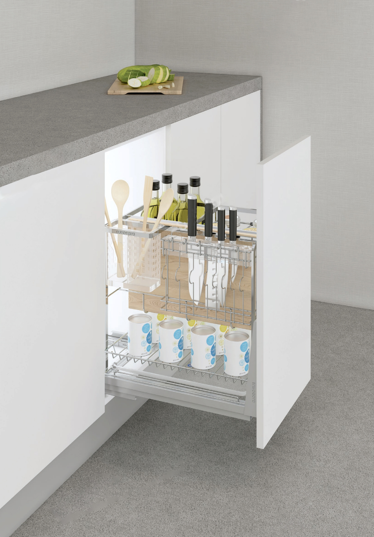 Tối ưu hoá không gian lưu trữ: Giá dao thớt khung rổi inox 304 nan dẹt EP30F được thiết kế nhiều ngăn chứa với chức năng khác nhau, phù hợp với để lưu trữ dao thớt, kéo và các dụng cụ nhà bếp khác. Điều này giúp tiết kiệm không gian và giữ cho khu vực bếp luôn gọn gàng. Hệ thống giá dao thớt được liên kết với ray âm giảm chấn giúp cho việc kéo ra và đẩy vào êm ái hơn giúp tiền kiệm thời gian và công sức.