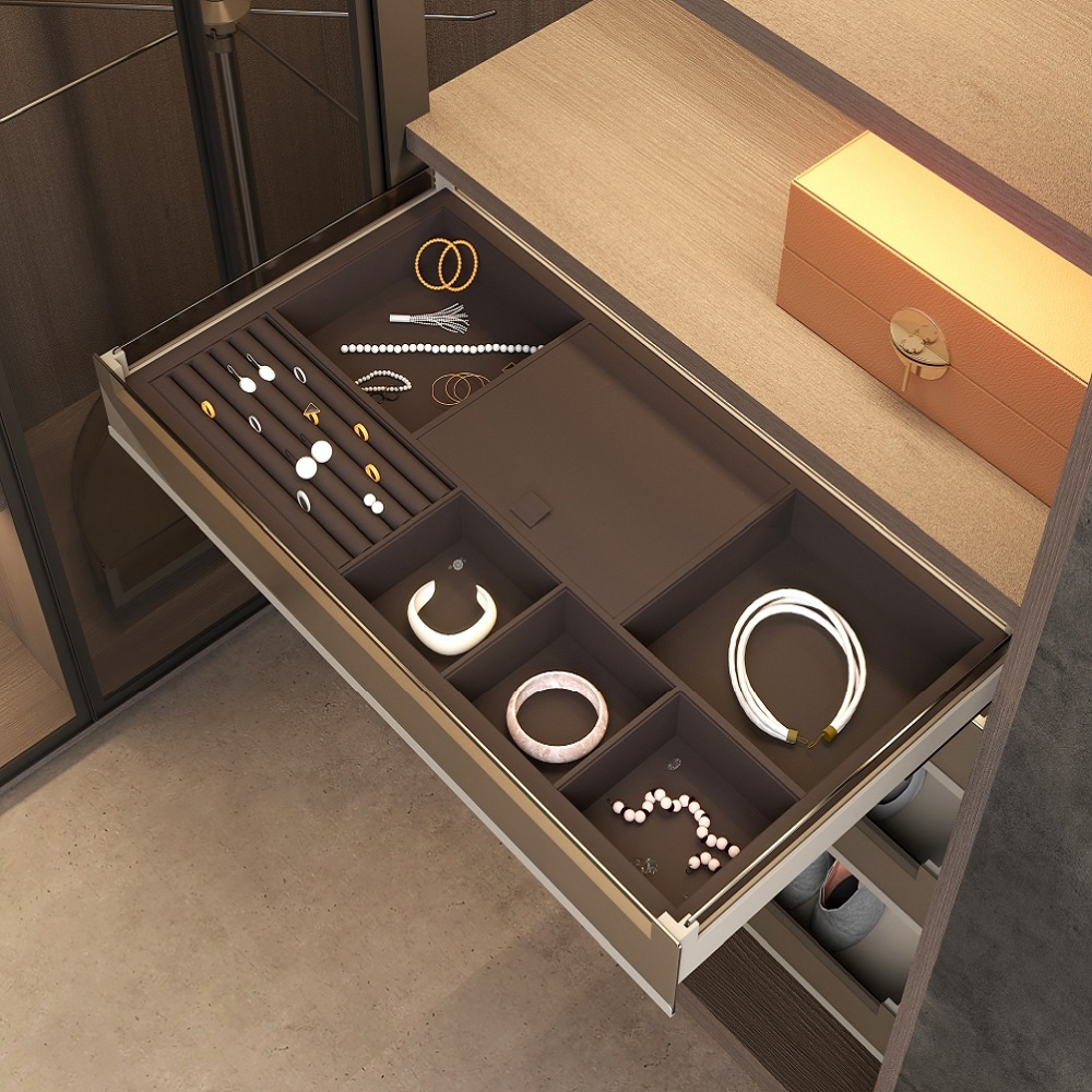 Thiết kế thông minh với 2 thanh ray trượt âm giảm chấn giúp nâng tầm giá trị cho giá để trang sức. Có thể mở toàn phần giúp bạn dễ dàng quan sát được toàn bộ đồ trong giá. Thiết kế giảm chấn vừa giúp giảm tối đa tiếng ồn lại vừa hạn chế va chạm mạnh giúp tăng tuổi thọ cho ray hơn các loại thanh trượt bi thông thường.