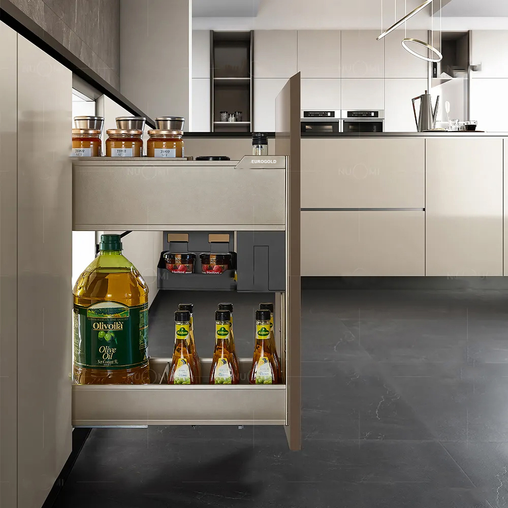 Giá gia vị Eurogold EUM2040 có bộ cơ cấu trượt vô cùng chắc chắn, có khả năng chịu được tải trọng lớn. Tích hợp giảm chấn giúp bạn đóng mở nhẹ nhàng, êm ái không hề tạo ra tiếng ồn khi kéo cánh.