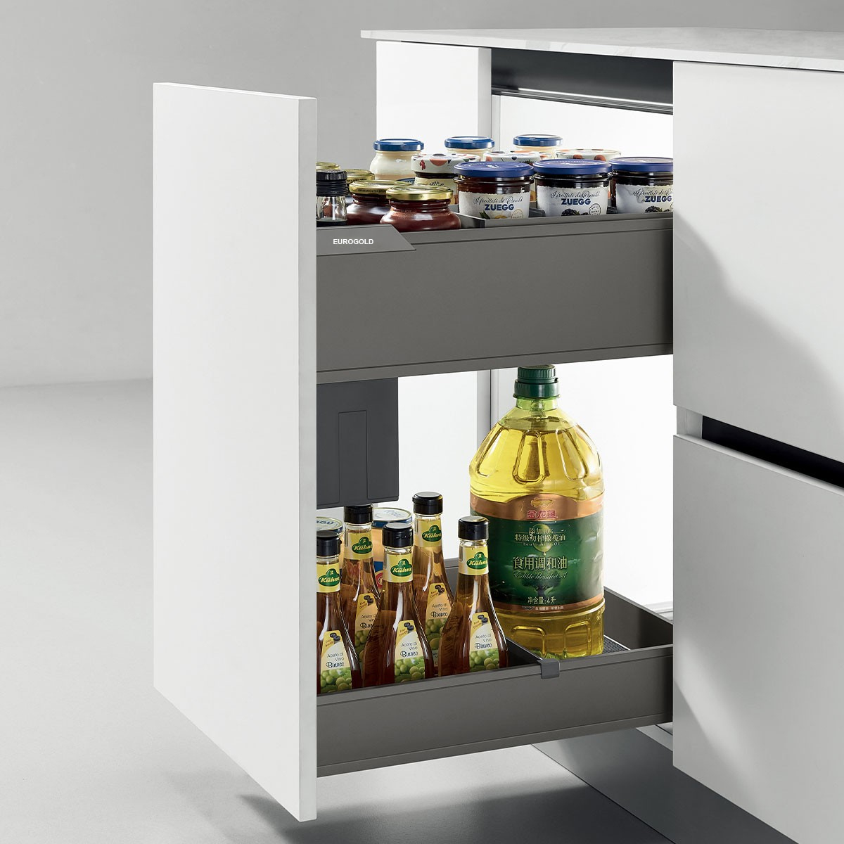 Thiết kế khá nhỏ gọn, giúp bạn tận dụng được tối không gian lưu trữ hệ tủ bếp dưới. Giá gia vị Eurogold EUM2140G được thiết kế bao gồm rổ đựng và hệ thống ray trượt giảm chấn. Việc sử dụng giá (kéo ra/ đẩy vào) trở nên êm ái mà vô cùng nhẹ nhàng. Cấu trúc độc đáo của giỏ kéo ra, có khay đựng dao kéo bên trong trượt, cải thiện tỷ lệ sử dụng không gian.