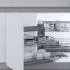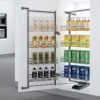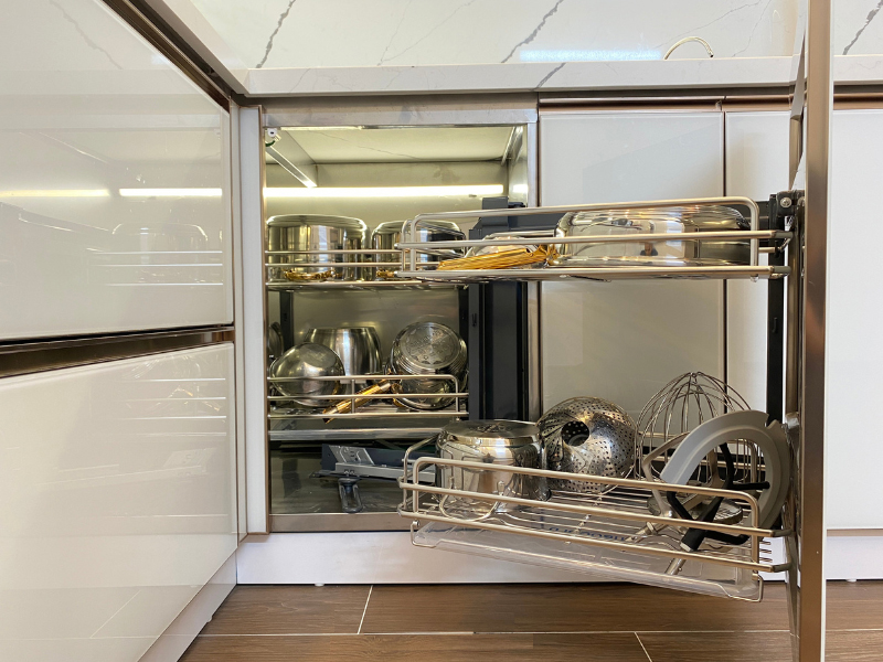 Các khay đựng được thiết kế linh hoạt phù hợp với nhiều kích thước chai lọ, gia vị, nồi chảo khác nhau trong không gian bếp.