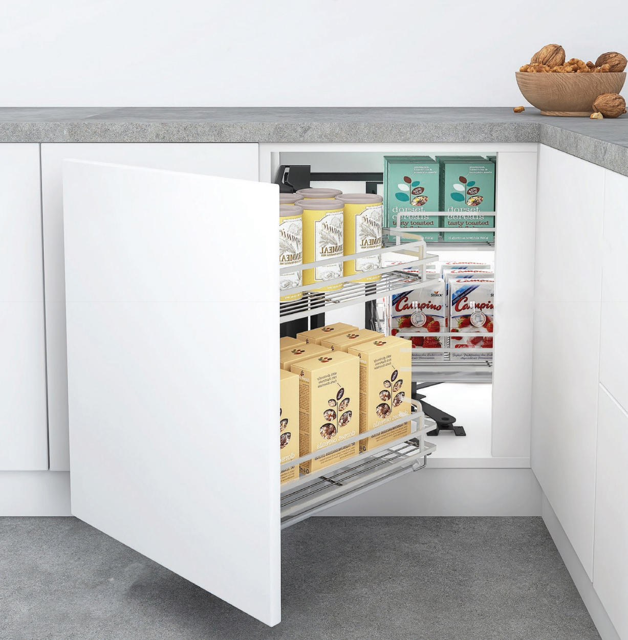 Góc liên hoàn Eurogold EPL101 được bắt trực tiếp vào cánh tủ kết hợp với bộ cơ cấu chuyển động có thể đảo chiều thông minh nên khi mở cánh tủ, 2 khoang chứa được gắn với cánh tủ di chuyển theo giúp dễ dàng nhìn thấy và để vào/lấy ra toàn bộ đồ trên giá.