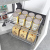 Các khay đựng được thiết kế linh hoạt phù hợp với nhiều kích thước chai lọ, gia vị, nồi chảo khác nhau trong không gian bếp.