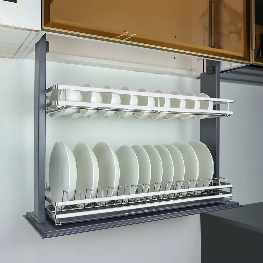 Cấu tạo 2 tầng với 2 chức năng: tầng trên úp bát, tầng dưới úp đĩa. Các thanh nan được cải tiến trong thiết kế và kích thước được đo lường chuẩn xác. Giúp cho bát đĩa luôn được úp thẳng đứng, không bị xô lệch hay bị rơi khỏi giá trong quá trình nâng lên/ hạ xuống từ tủ bếp trên.