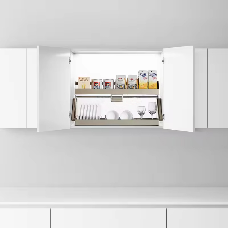 Thiết kế khá nhỏ gọn, giúp bạn tận dụng được tối không gian lưu trữ hệ tủ bếp trên. Giá nâng hạ đồ khô bát đĩa 2 tầng Eurogold EUM9090 được thiết kế bao gồm rổ đựng và hệ thống thống nâng hạ giảm chấn. Việc sử dụng giá (kéo xuống/ đẩy lên) trở nên êm ái mà vô cùng nhẹ nhàng.
