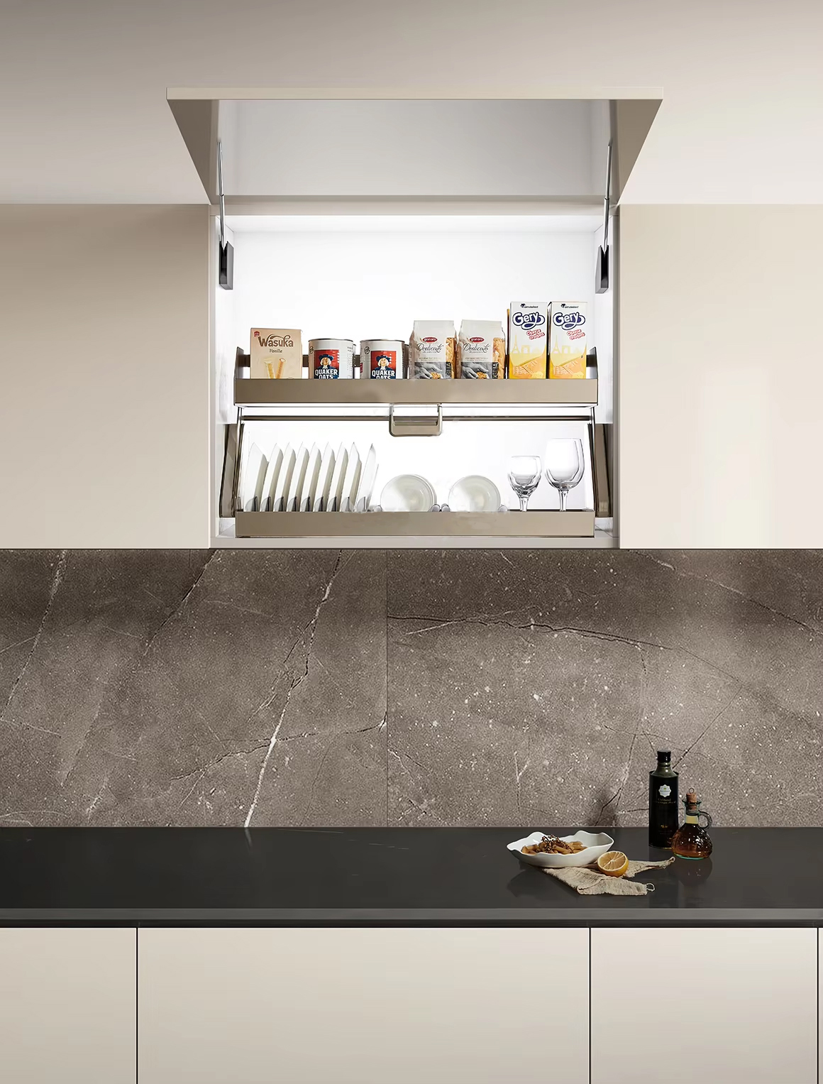 Thiết kế viền mỏng, thể hiện phong cách tối giản và sang trọng nhẹ nhàng, tăng cường khả năng lưu trữ trong bếp. Đáy được phủ thảm chống trượt, ngăn các vật dụng va chạm và thuận tiện trong quá trình vệ sinh.