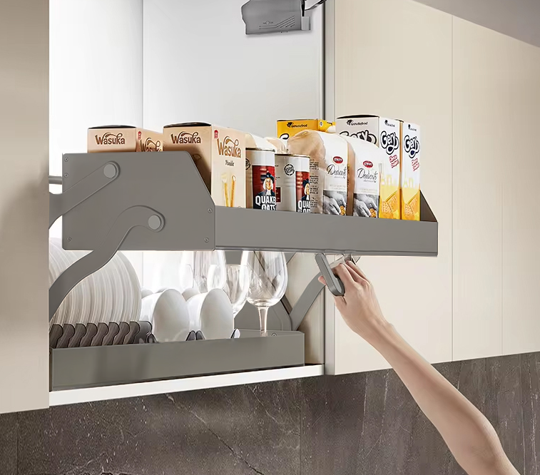 Giá nâng hạ đồ khô bát đĩa 2 tầng Eurogold EUM9160G có bộ cơ cấu nâng hạ vô cùng chắc chắn, có khả năng chịu được tải trọng lớn. Tích hợp giảm chấn giúp bạn đóng mở nhẹ nhàng, êm ái không hề tạo ra tiếng ồn khi kéo xuống và đẩy lên.