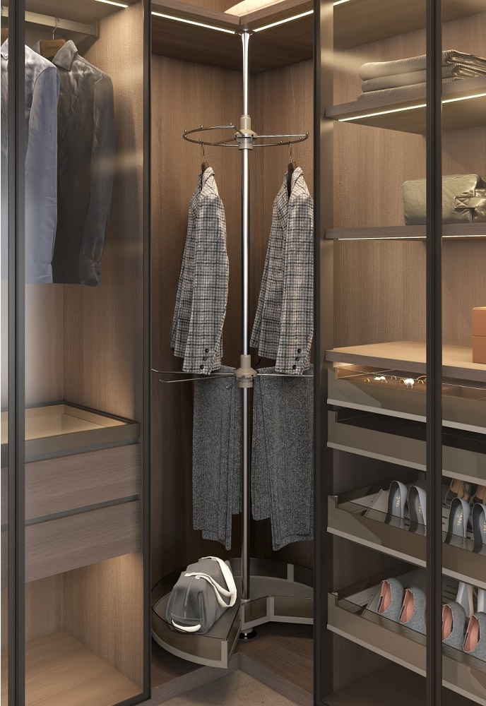 3 tầng giá được tính toán và thiết kế theo 3 kiểu chuyên biệt nhằm tối ưu cho 3 mục đích bảo quản khác nhau, vừa hợp lý, vừa giúp gia chủ để được thêm một khối lượng lớn quần áo phụ kiện.
