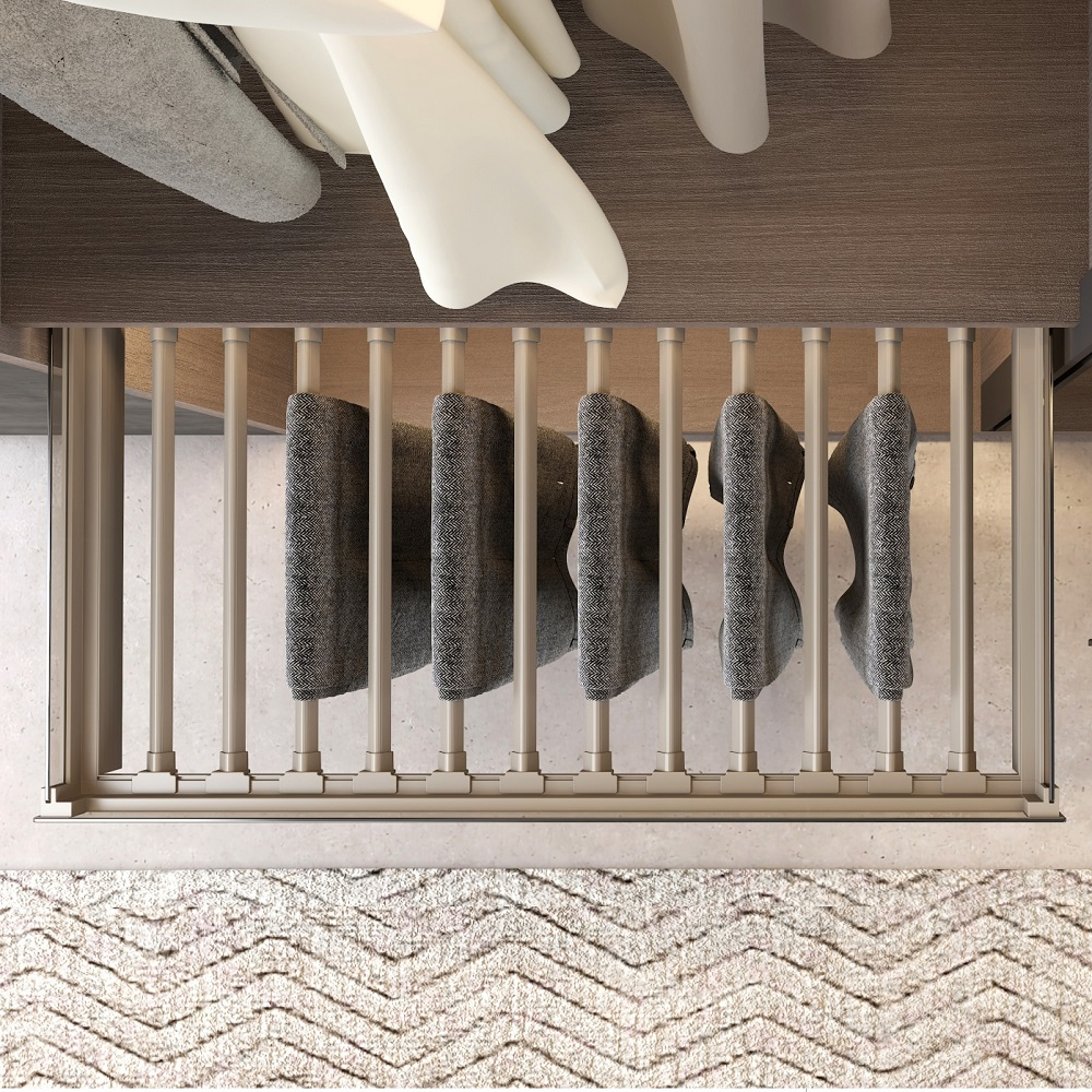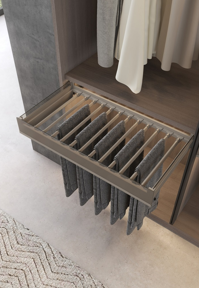 Hệ thống tay âm giảm chấn cao cấp có cấu tạo bền chắc, chịu được tải trọng cao. Có thể mở toàn phần và quan sát được toàn bộ quần trên giá treo. Mở ra, đóng vào dễ dàng, êm ái không phát ra tiếng ồn.